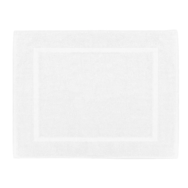 Hotelová předložka z vysoce kvalitního froté (pevná kratší dvojsmyčka, dvojité obšití, schopnost zvládnout několik stovek pracích cyklů), 100% bavlna, 650 g/m2, tenký proužek, vyváření na 90 °C.