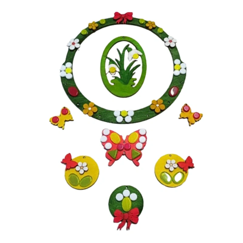 Kompletní jarní set: V jedné sadě získáte hlavní věnec a několik menších závěsů, které navážete do předvrtaných dírek