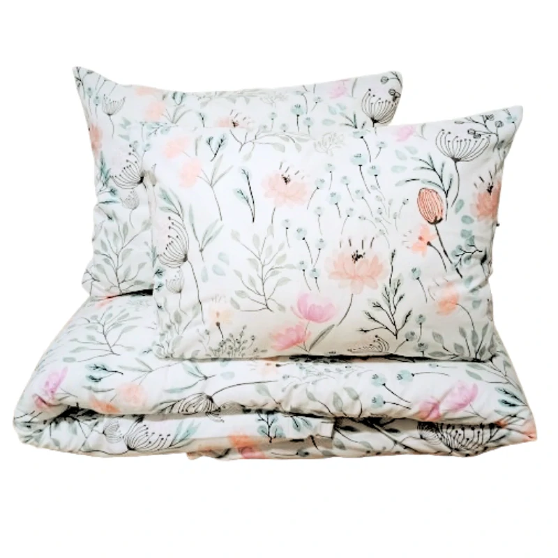Proměňte svou ložnici v rozkvetlou zahradu, která nikdy neuvadne. Toto povlečení s jemným floristickým motivem přináší do interiéru neuvěřitelnou lehkost a ženskost. Design kombinuje něžné růžové květy s lístky v odstínech šalvějové zelené na čistě bílém podkladu.Vzor je romantický, uklidňující a prosvětlující.