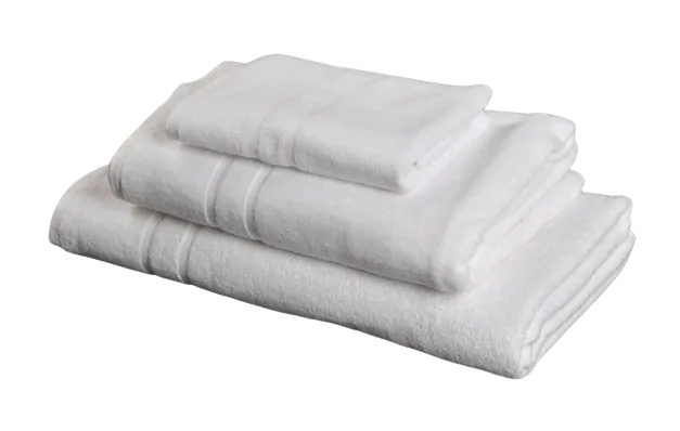 Hotelový ručník z vysoce kvalitního froté (pevná kratší dvojsmyčka, dvojité obšití, schopnost zvládnout několik stovek pracích cyklů), 100% bavlna, 450 g/m2, dva tenké proužky, vyváření na 90 °C.