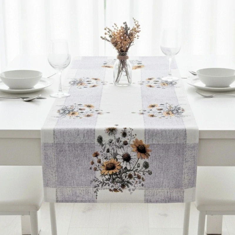 Vneste do své jídelny nádech venkova a hřejivou atmosféru letní louky. Tento ubrus s jemným motivem slunečnic a kopretin je ideálním doplňkem pro každodenní stolování i slavnostnější příležitosti. Díky kombinaci žlutých květů a decentního šedého podkladu s mřížkovým vzorem působí elegantně a útulně zároveň.